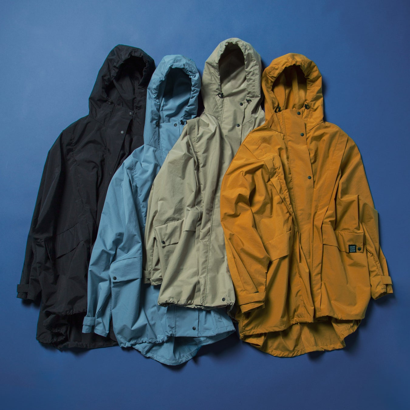 自然な光沢をもつナイロン生地は、撥水性が高く、表面でしっかり水を弾きます。後ろの裾が長めに設計されているため、バックパックを背負ったまま着用しても、きれいなシルエットをつくってくれます。急な雨でも大切なバッグを守ることができる、心強いライトアウターです。