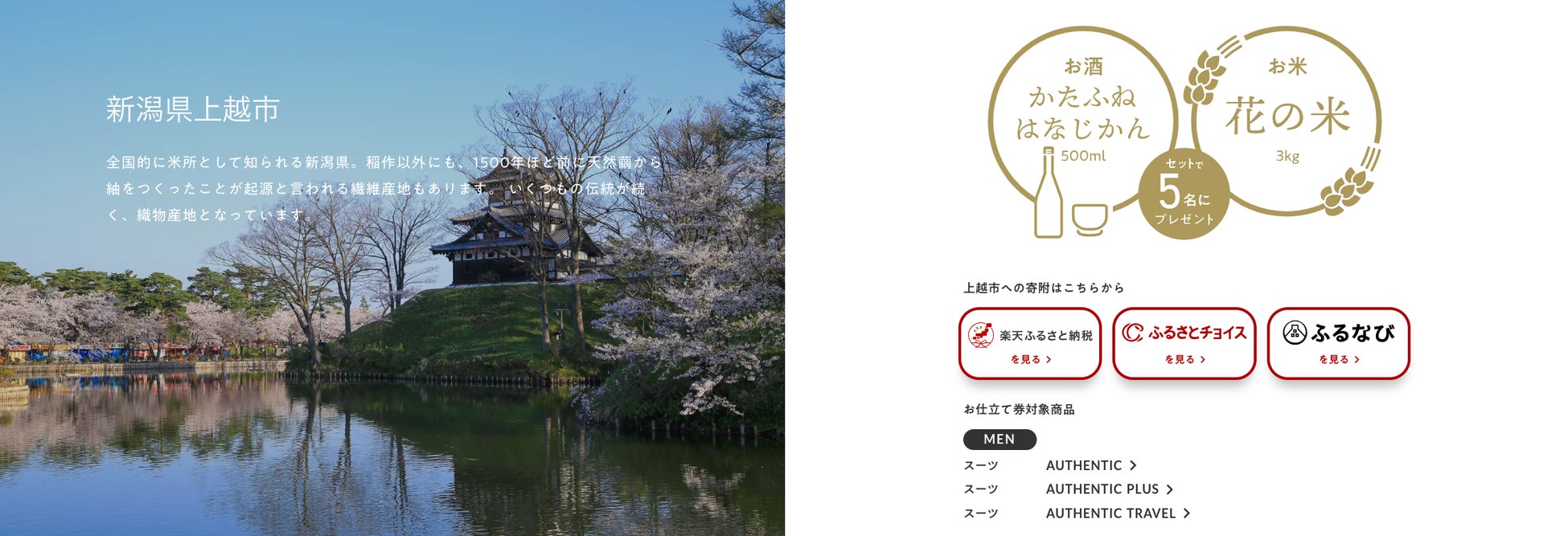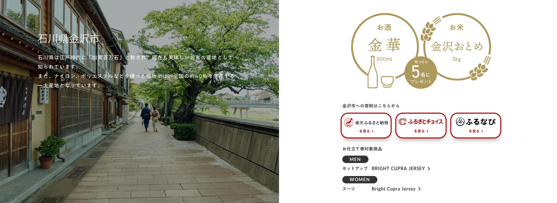 FABRIC TOKYOは、2022年10月よりふるさと納税の返礼品事業者として参加。スーツやシャツの生地・縫製工場がある自治体で、オーダーアイテムのお仕立て券を返礼品にご用意しています。本キャンペーンでは、対象の自治体(兵庫県西脇市、新潟県上越市、石川県金沢市)でFABRIC TOKYOの返礼品をお選びいただいた方の中から、合計15名に日本酒とお米のセットが当たります。