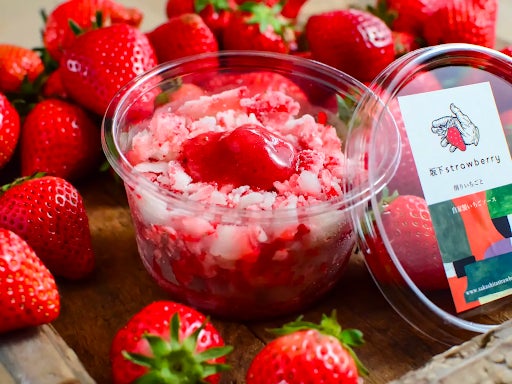 農薬をできるだけ使わずに天敵昆虫を入れることで自然の食物連鎖ピラミッドを構築し、一株づつ手作業でいちごを栽培。自家製のいちごソースの上にサクサクと削ったいちごをのせました。乳製品を使わずレモン汁と砂糖のみで作っているため、いちごそのままの味を楽しめます。