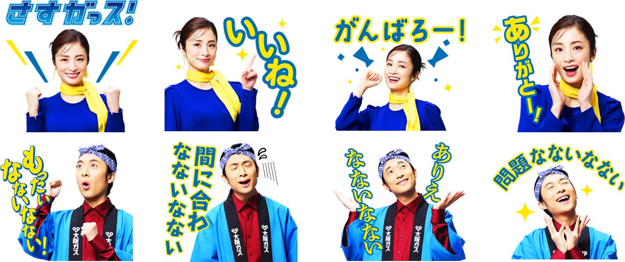 大阪ガスの新TVCM 『エネルギー「もったいなないなない」篇』の放映に合わせて、新TVCMに出演される上戸さん・友田さんのオリジナルLINEスタンプが登場!上戸さんのお馴染みのフレーズ「さすガっス!」やCMのフレーズ「もったいなないなない」スタンプなど、使いやすいスタンプをそろえています。友だちやお知り合いとのメッセージにぜひご利用ください!