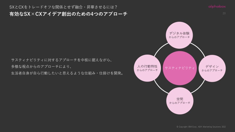 株式会社ADKマーケティング・ソリューションズ(本社:東京都港区、代表取締役社長:大山 俊哉、以下「ADK MS」)は、日本アイ・ビー・エム株式会社(本社:東京都中央区、社長:山口 明夫、以下 「日本IBM」)との共同事業であるCXコンサルティング・ユニットalphaboxにおいて、企業のサステナビリティ活動の推進・浸透を支援する新たな手法「CASES」の提供を開始しました。