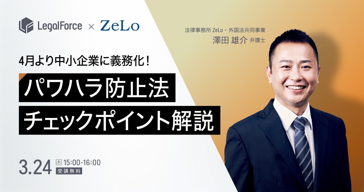 AI契約審査プラットフォーム「LegalForce」、AI契約管理システム「LegalForceキャビネ」を提供する株式会社LegalForce(本社:東京都江東区 代表取締役CEO:角田望、以下LegalForce)は、2022年3月24日(木)15時より、オンラインセミナー「2022年4月より中小企業に義務化!パワハラ防止法のチェックポイント解説セミナー」を開催いたします。