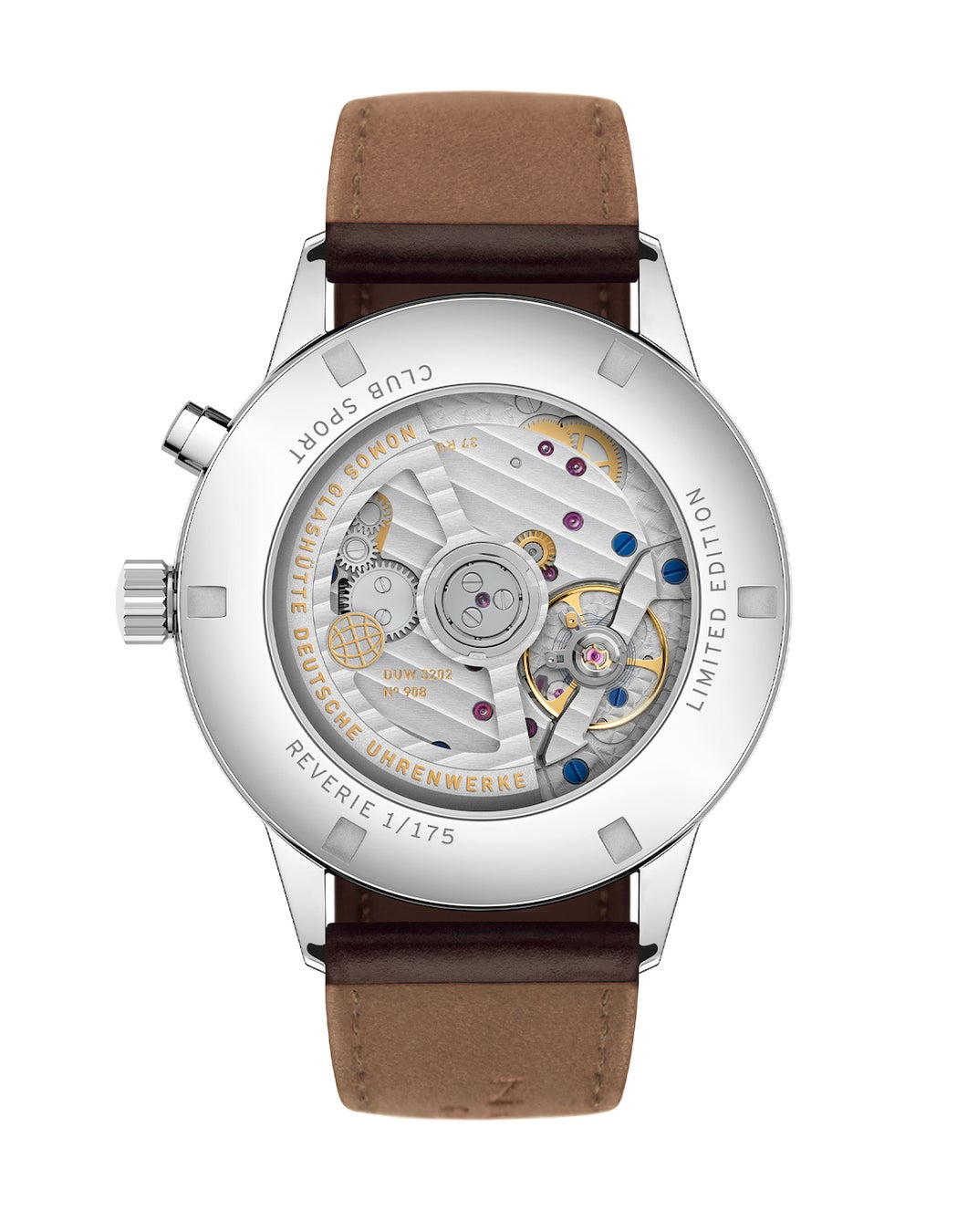 「クラブスポーツ ネオマティック ワールドタイマー レヴェリ-」はシャンパン色のサンバースト仕上げの文字盤に、砂、黄土、ワインレッド、黄色のカラーが多面的に魅力的な効果をもたらします。時刻表示の数字とインデックスは白いスーパールミノバで設計されています。