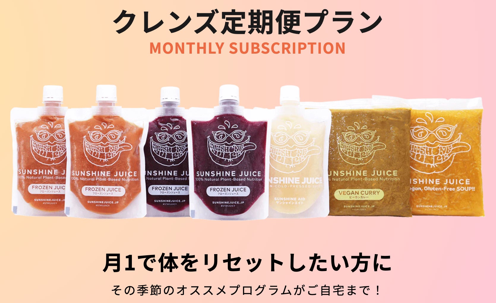 「SUNSHINE JUICEの定期購入」は、「ジュースクレンズプログラム」「デイリージュース」「new moon juice club」の3種類備えており、それぞれお客さまの生活スタイルやペースに合わせて体の調子を整えることができる商品を大変お得に購入することが可能となっています。