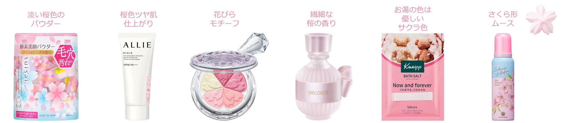 (左から)スイサイ / ビューティクリア パウダーウォッシュN さくら&ピーチの香り(2/19発売)、アリィー(ALLIE) / アリィー クロノビューティ トーンアップUV 04(2/12発売)、ジルスチュアート / ブルーム ミックスブラッシュ コンパクト / 21 rosy cherry blossom(2/25発売)、コスメデコルテ /コスメデコルテ キモノ サクラ オードトワレ(2/16発売)、クナイプ / クナイプ バスソルト サクラの香り(1/12発売)、ハウス オブ ローゼ さくらふふふ ボディホイップムース(2/2発売)
