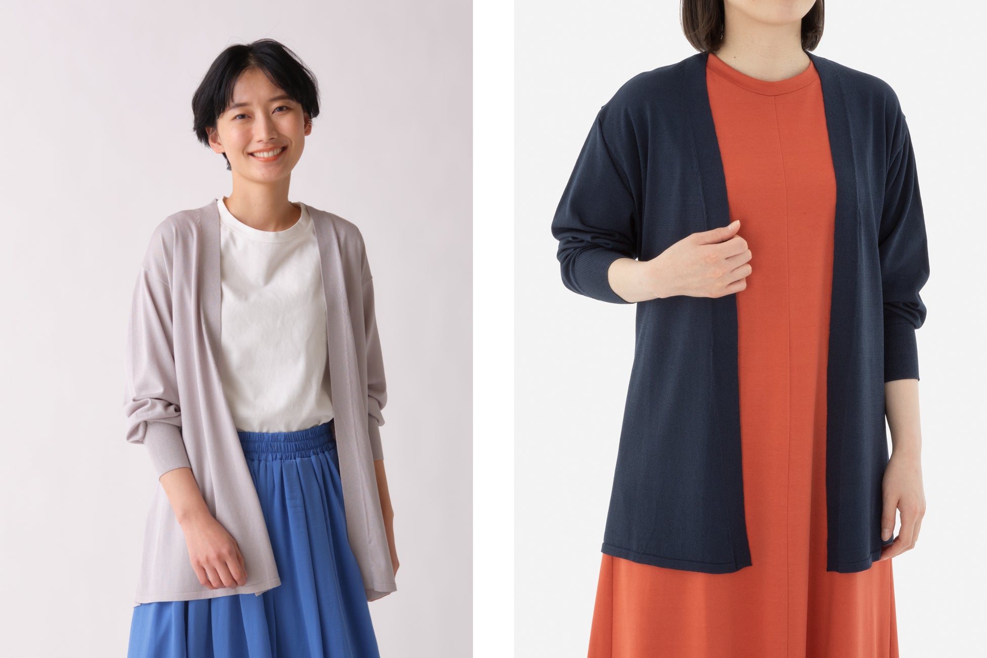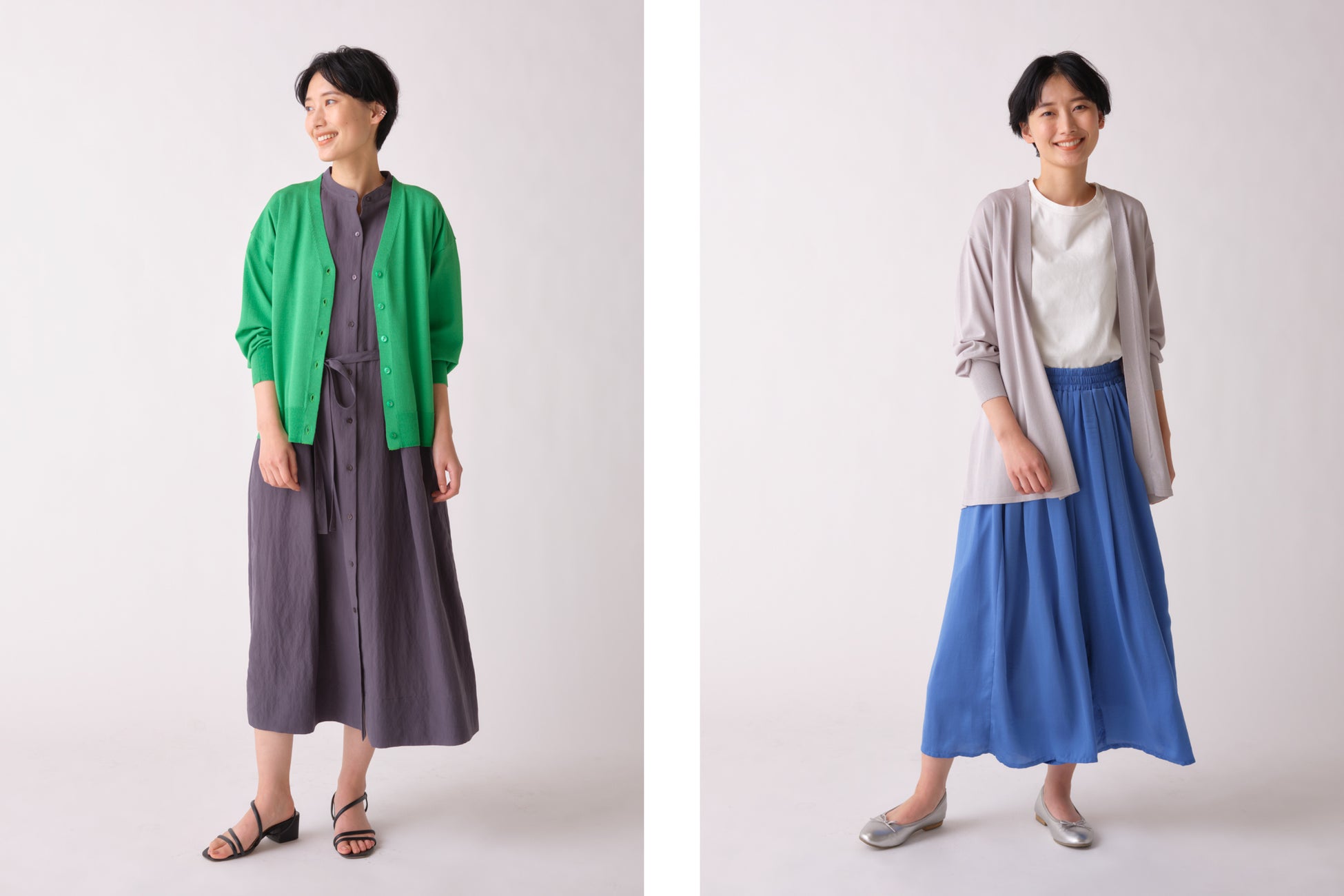 さらりとした肌ざわりが心地よい、接触冷感糸を使用した洗えるニットカーディガン。ゆったりとしたアームホールでワンピースやトップスとの重ね着もしやすく、冷房対策にもおすすめです。自宅で洗えるイージーケアです。
