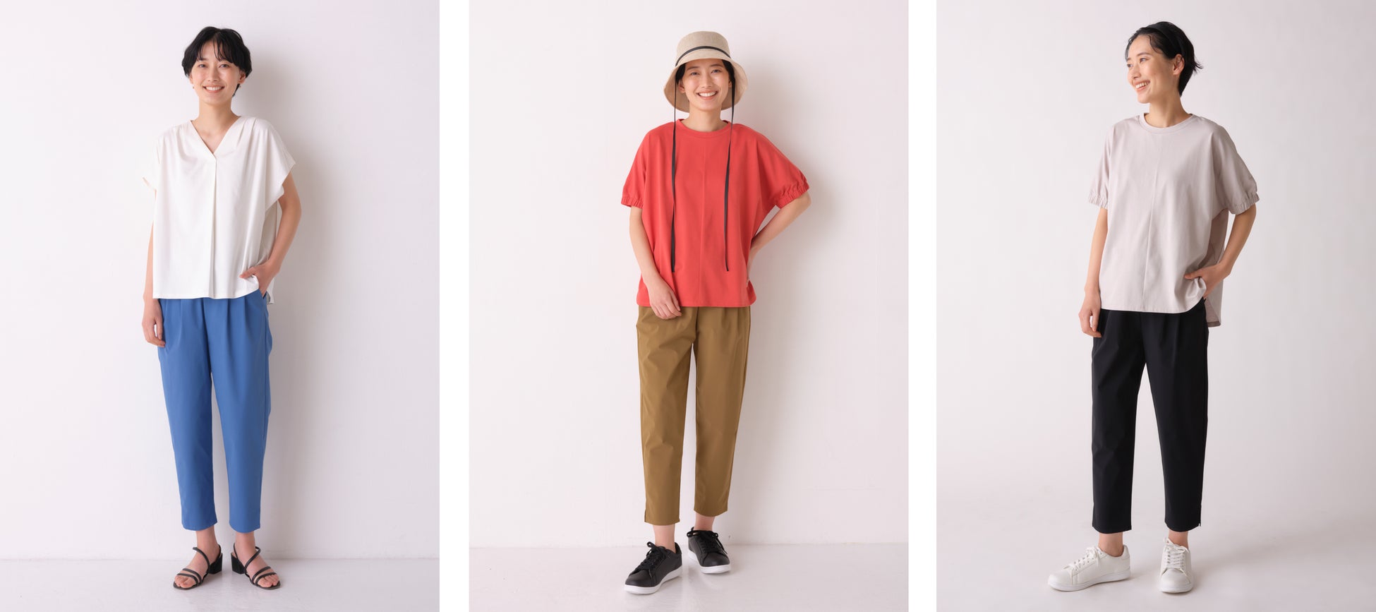 毎年人気の接触冷感パンツ。今年は撥水機能もついて、さらに日常使いに便利なアイテムになっています。ウエストギャザーが体型を拾いにくく、ウエストゴムで1日中快適なはき心地です。ストレッチが効いてシワになりにくく、オンもオフも天候も気にせず着まわしできます。洗濯機で洗えるイージーケアです。