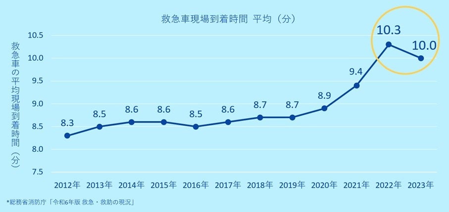 街中や施設内で突如倒れた傷病者に遭遇した際、救急車を呼んで助けを求めますが、救急車の平均到着時間は数年前よりも延伸しており、2022年は10.3分、2023年は10.0分かかっています(図1)。