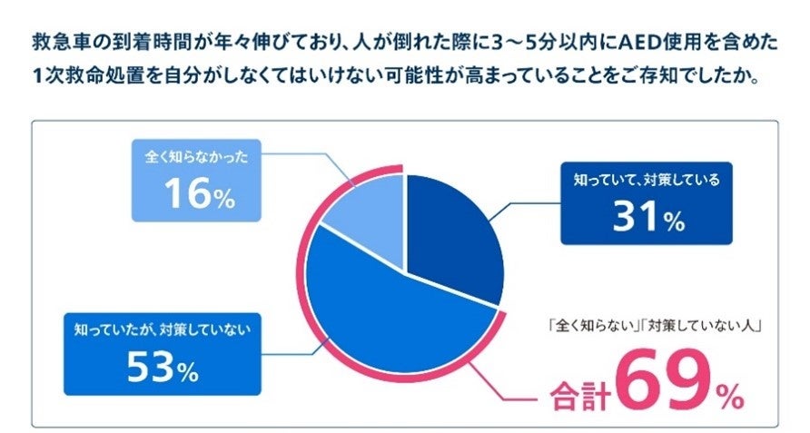 その結果、日本での救急車到着時間が伸びていることから救急車到着前に自分がAEDで一次救命する必要性が高まっている現状認識については、「全く知らない」「対策していない人」が69%となりました(図3)。