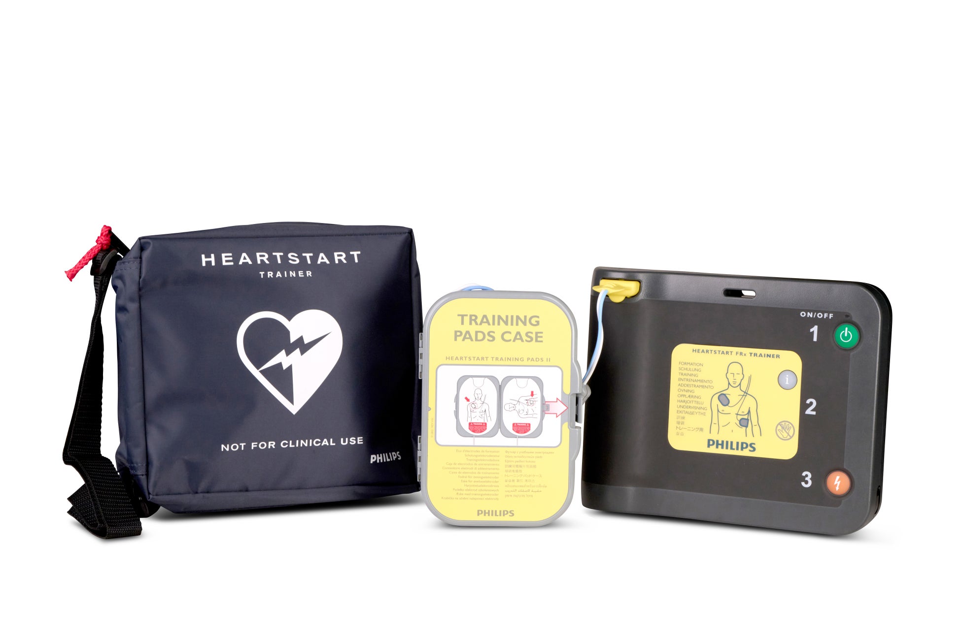 今回、FRxトレーナーは、筐体の色を従来のブルーから、ハートスタートFRxと同じグレーへリニューアルしました。AEDハートスタートFRxの実機と同じ形状、同じ操作方法、同じ音声ガイダンスで、さらにAED実機さながらの仕様でご使用いただけます。フィリップスでは、AEDの実機をはじめ、トレーナー関連機材も取り揃えております。