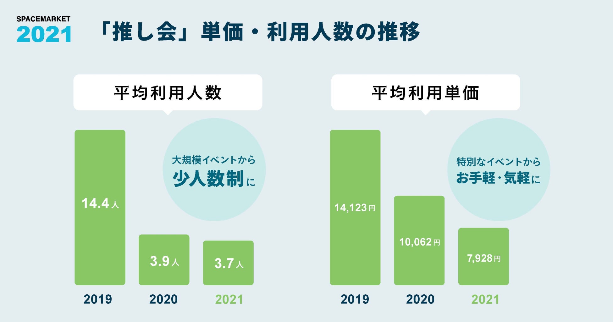 2019年から2021年の2年間で、「推し会」の開催傾向に変化が見られました。2019年には、レンタルスペースを利用した「推し会」の平均開催人数は平均15名程度で、握手会やオフ会などイベント的に利用された一方、2021年現在の平均開催人数は4名弱となりました。また金額面は、レンタルスペースの1度あたりの平均利用金額が14,123円から7,928円となり、仲間内でより気軽に開催するイベントへと変化しました。