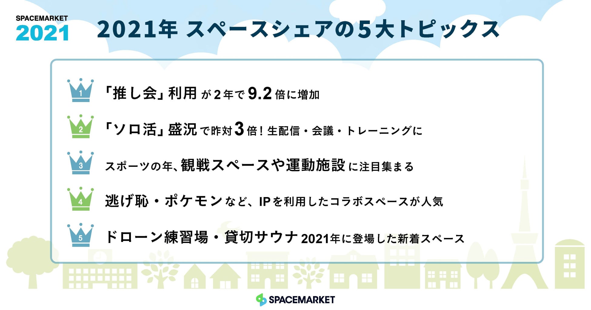 スペースマーケット「スペースシェア・トレンド2021」発表!「推し会」目的のレンタルスペース利用が2年で9.2倍