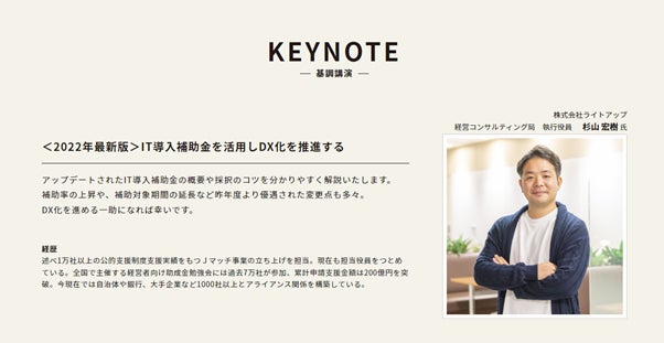 「全国、全ての中小業を黒字にする」をミッションに掲げ、中小企業のDX化を推進しているライトアップの執行役員 杉山宏樹から「アップデートされた「IT 導入補助金」の概要や採択のコツ」をテーマに、DX化の障壁となっている「資金面」の課題を解決するための情報をお届けします。