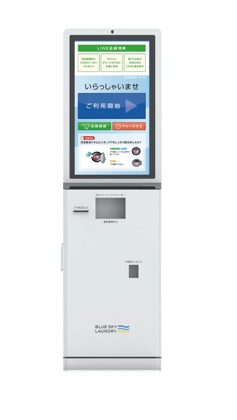 キャッシュレス決済が可能なブルースカイランドリー専用精算機「ブルスカなび2」を設置し、ランドリー機器のお支払いをすることができます。加えて、こちらの機器は国内アクティブユーザー月間9,200万人を超えるソーシャルメディア【LINE】と連携させる事により、お客様の利便性を向上させた精算機となります。
