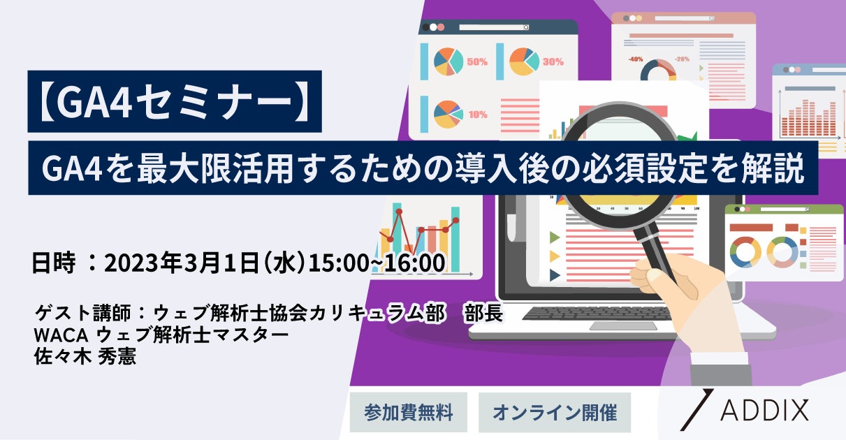 株式会社ADDIX(所在地:東京都港区、代表取締役社長:前田耕一 以下、ADDIX)は、「Google アナリティクス 4(GA4)」をビジネスに最大限に活用していくために必要な設定をご紹介するセミナー(https://service.addix.co.jp/seminar/event_ga4_230301)を開催します。