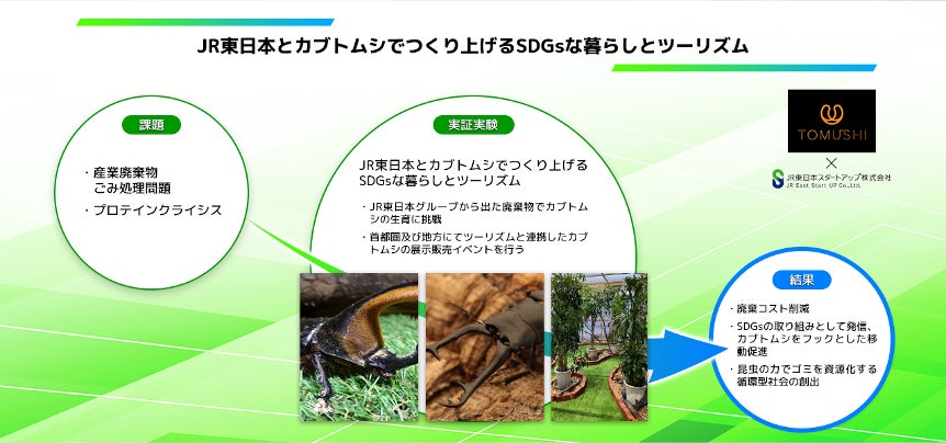 JR 東日本グループから出た廃棄物でのカブトムシの生育に挑戦し、廃棄コスト削減と有価物としての販売のほか、生育したカブトムシは駅での展示販売を通して SDGs の取り組みとして発信し、移動の促進を目指す。