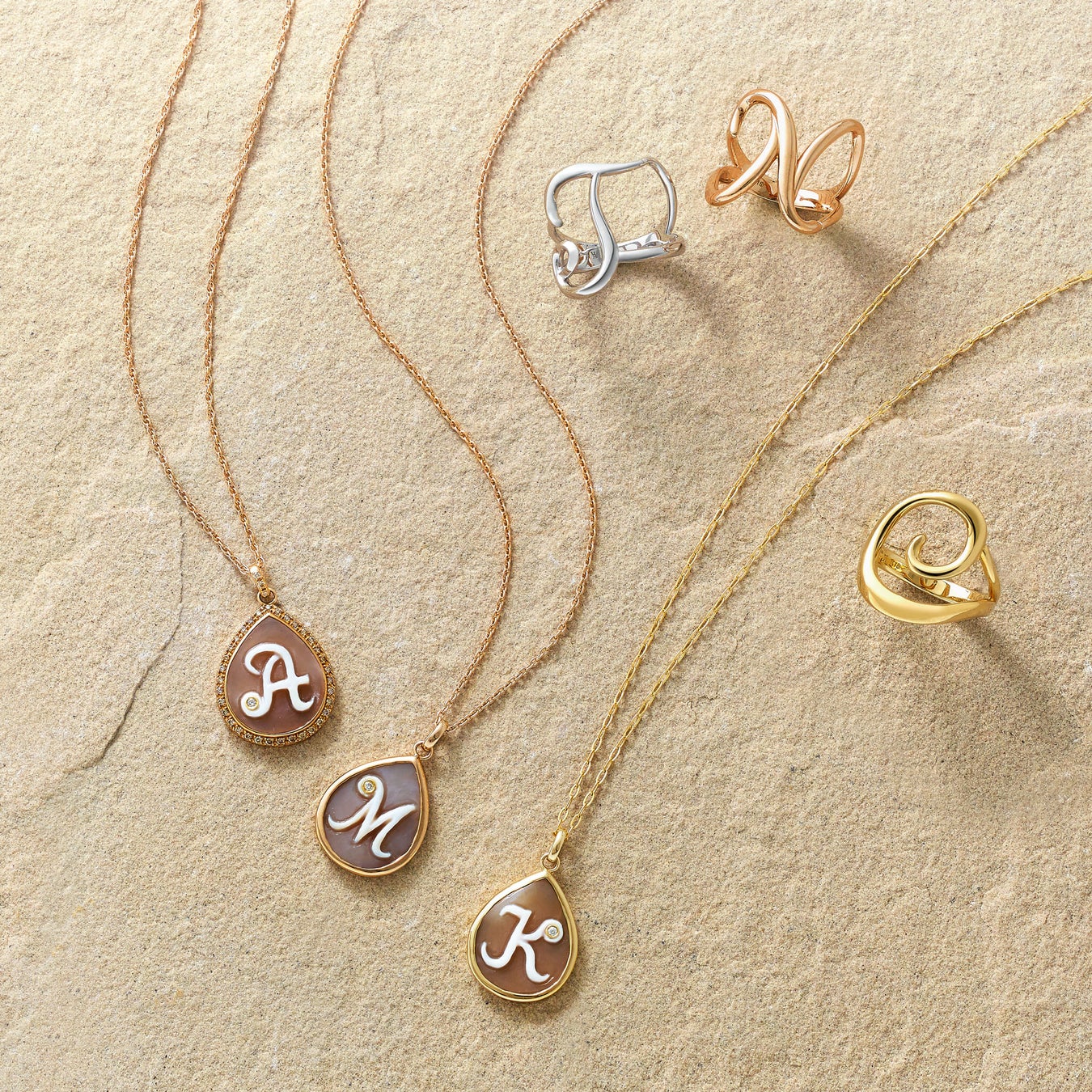 タイポグラフィカルで大胆なデザインのイニシャルリングとシェルカメオネックレスは、