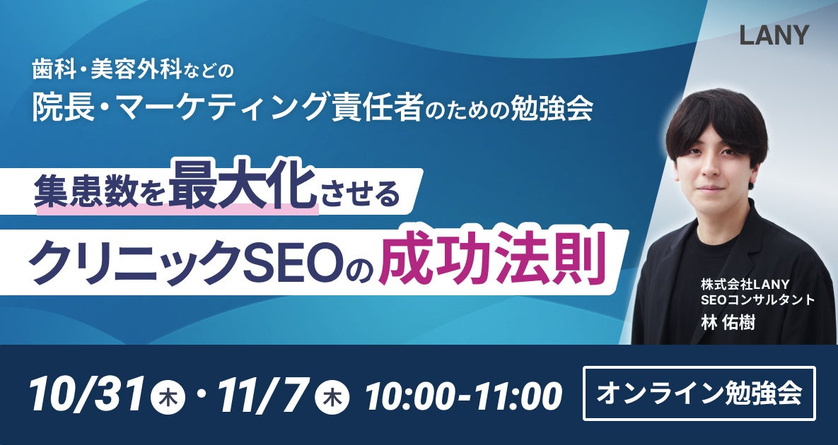 10月31日(木)、11月7日(木)10:00-11:00に、歯科・美容外科などの院長・マーケティング責任者のための勉強会「集患数を最大化させる、クリニックSEOの成功法則」を開催いたします。