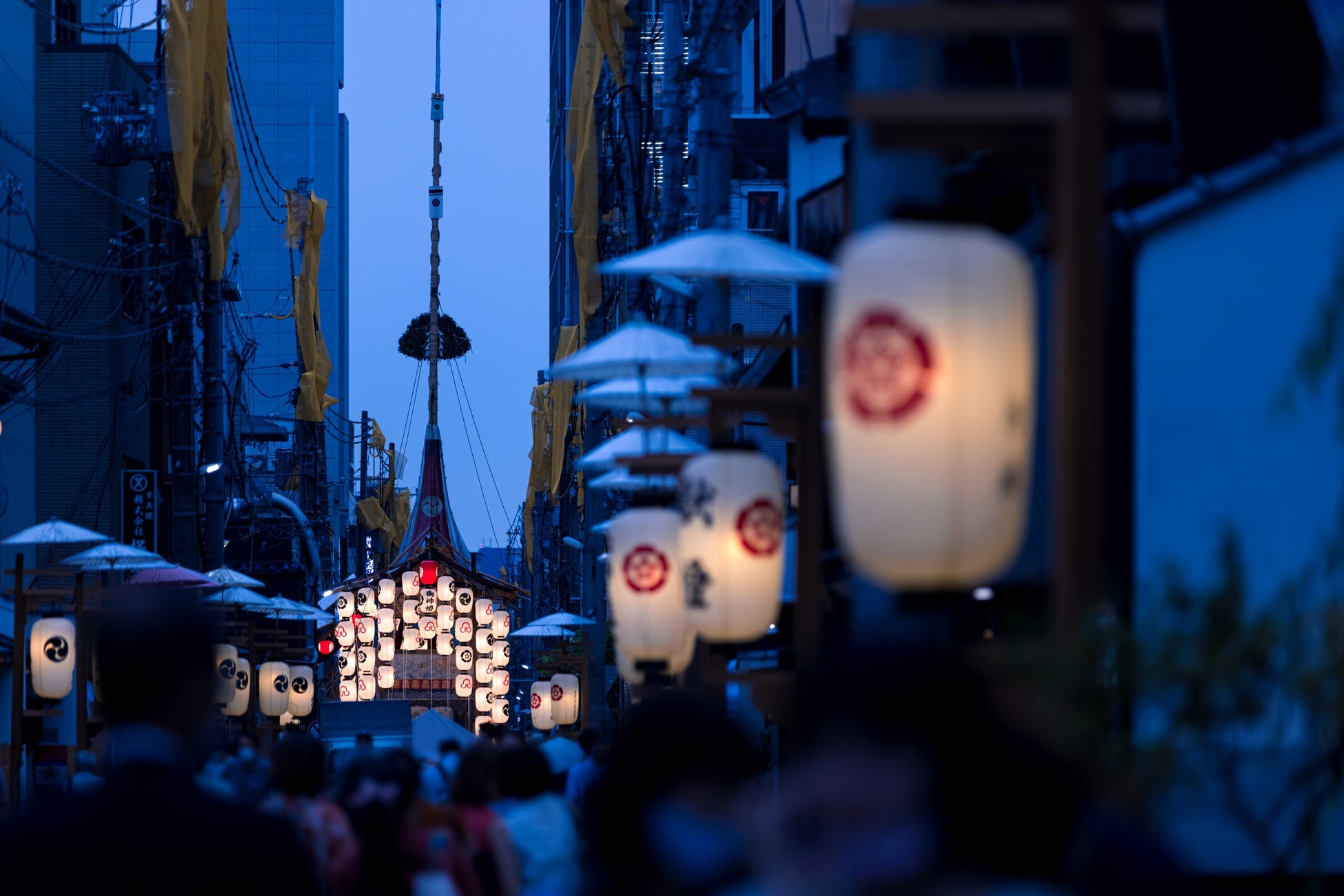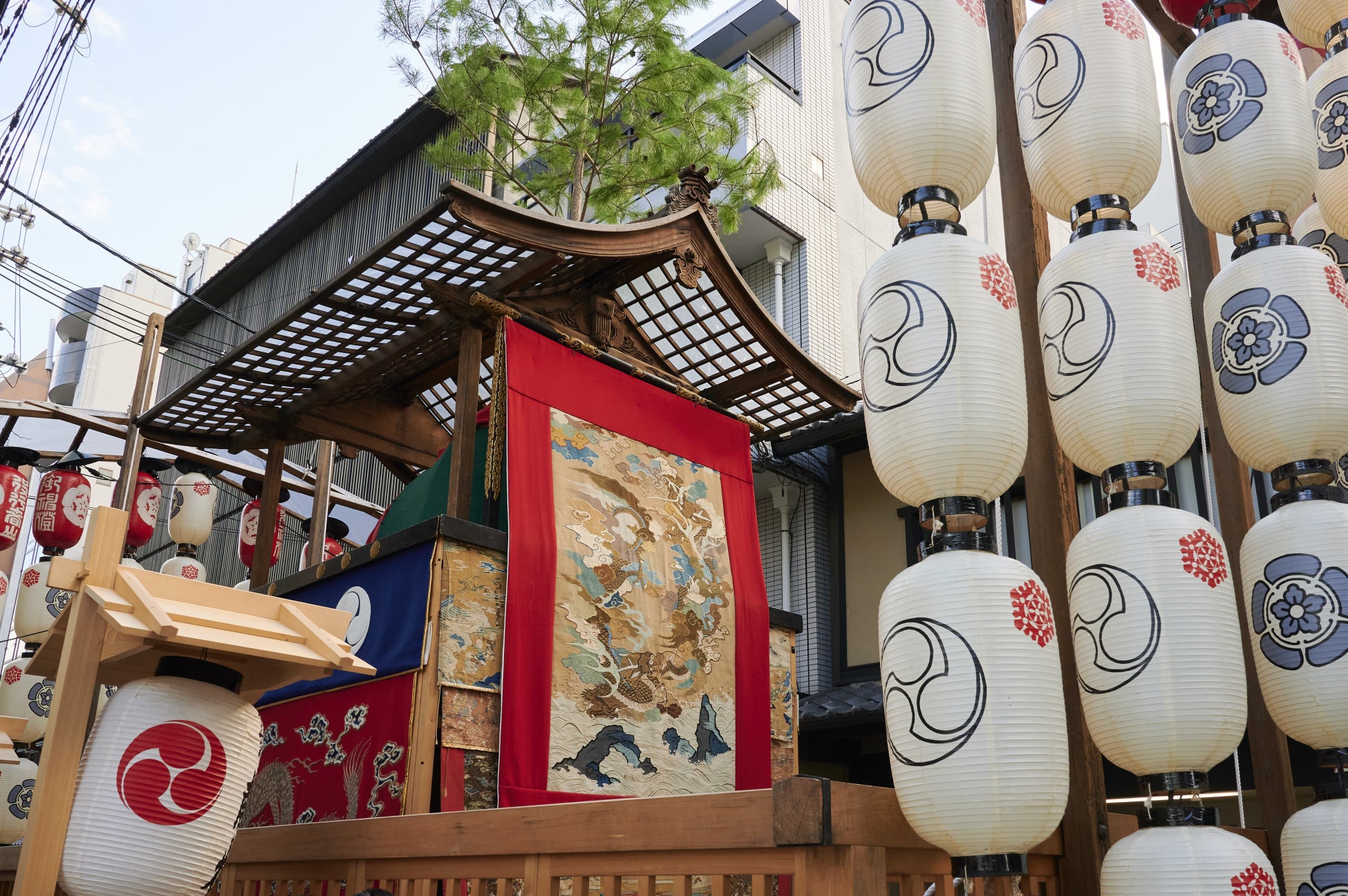 7月10日に前祭の山鉾を組み立てる「山鉾建て」を皮切りに、巡行さながらに山鉾を動かす「山鉾曳き初め」、厄除けちまきの販売、祇園囃子が鳴り山鉾に提灯が灯された景色が美しい「宵山」、そして7月24日に迎える後祭・山鉾巡行までの期間、市中の各所に建つ山や鉾を見学しながら祇園祭の雰囲気を堪能できる行事がつづきます。