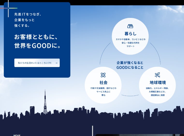 CTCは、情報通信・製造・金融・流通・卸売・官公庁・エネルギーなど、多岐にわたる業種のお客様の事業にITで貢献するBtoB企業です。CTCが先進のIT技術を組み合わせて実装し、お客様企業の競争力が向上し、その先にある消費者の生活や、社会、経済、ひいては世界に価値をもたらしていくというメッセージを「世界をGOODに」というコピーで表現しています。