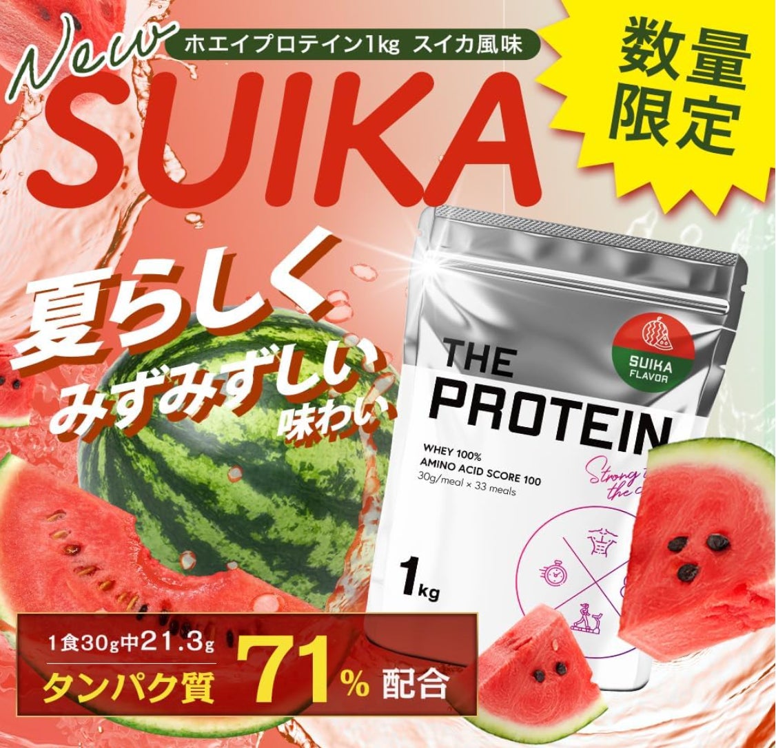 累計販売数50万個突破の THE PROTEIN(通称:ザプロ)からホエイプロテイン 1kg <スイカ風味>が販売スタート。ザプロファンの期待に応える今しか買えない数量限定フレーバーです!!