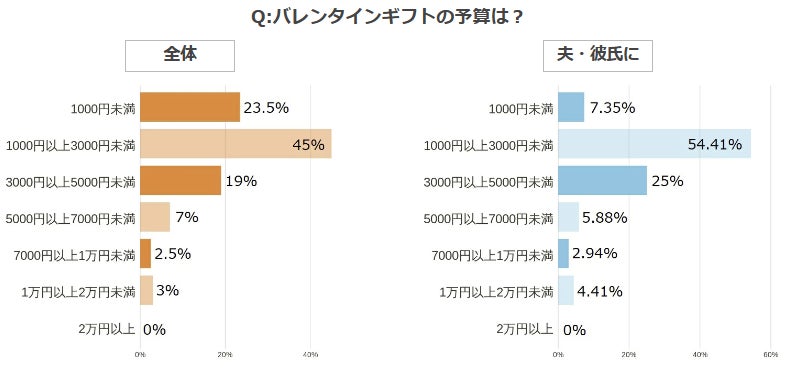 予算としては全体では1000円以上3000円未満が最も多く、45%という結果に。また、夫・彼氏に/自分に、の場合もこの範囲の予算額が最も高い割合となりました。