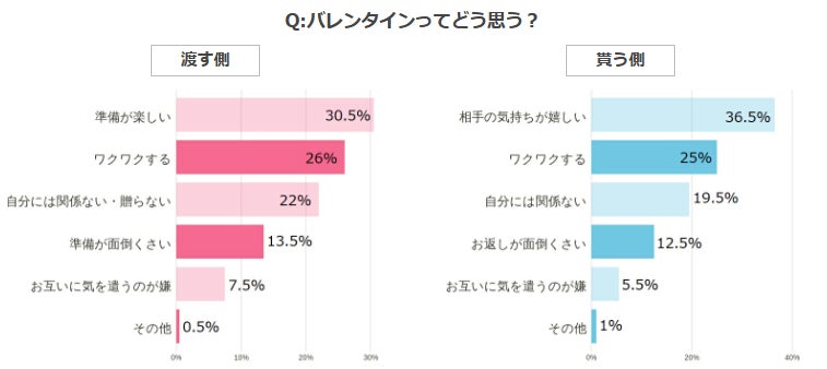 マイナスな意見としては、渡す側が43%、貰う側が37.5%ということで、これも決して少ない割合とは言えません。特に渡す側は4割以上の人がマイナスな感情を抱いていますので、バレンタインを楽しんでいる人が大半…ではないことが伺えます。 ただ内訳を見てみると、貰う側のマイナス意見37.5%のうちの大半は“自分には関係ない”という回答でした。そのため、貰って迷惑ということでもないようです。