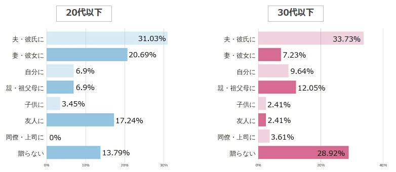 年代別に見ていくと、どの世代でも“夫・彼氏に”がトップではあるものの、“妻・彼女に”贈る割合が、20代以下では他の世代の倍の数値となりました。 また、“友人に”贈るという割合も、他の世代が3%以下であるところ、若い20代以下の世代では17%にも登っています。 このことから、バレンタインというイベントが“女性から男性へ”というものだという意識が、年齢が若いほど薄れていると考えられます。