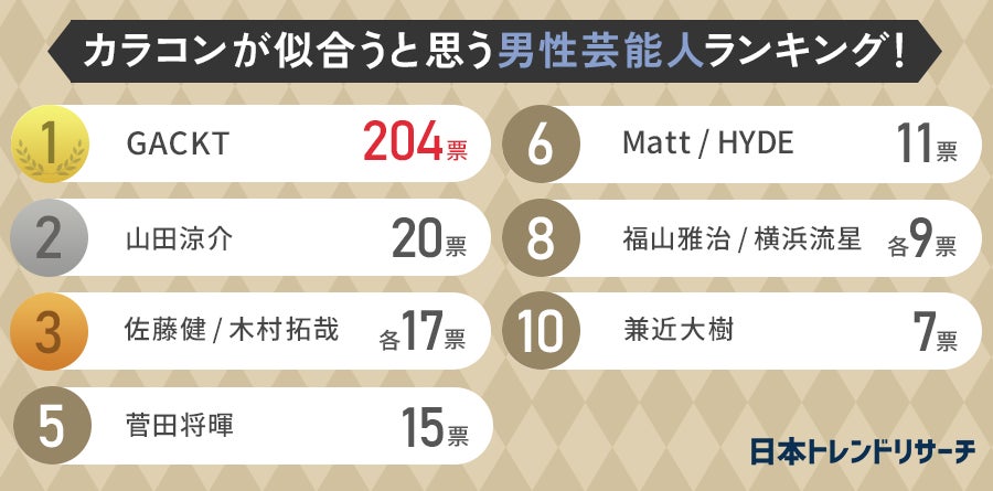 全体の4割を超える票数を獲得して圧倒的な第1位となりましたが、「GACKT」さんなら今後もいつまでも変わらず美しい姿を見せてくれそうですね。