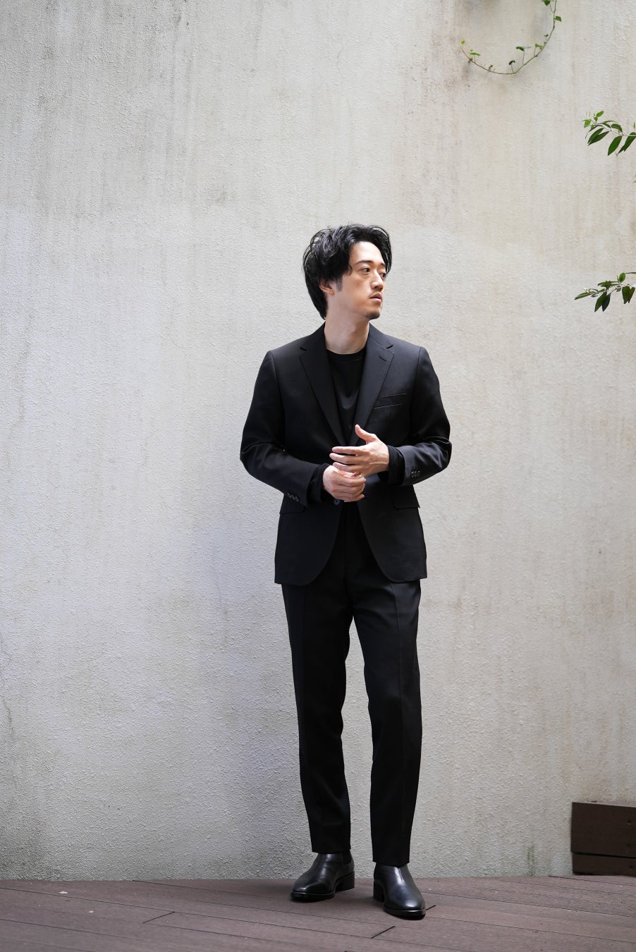 高密度のギャバジン生地で、肩パッドをなくし、裏地、芯を最低限とした軽いセットアップ仕様でありながら、スーツ見えする構築的なシルエットを実現。