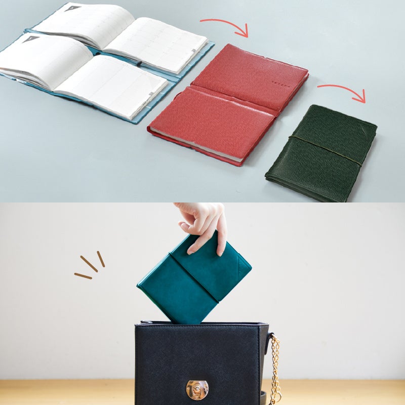 「TETEFU」は、軟質ビニール製の手帳カバーを採用しており、Wポケット加工が施されているため、上下に2冊の手帳を収納できます。手帳を開いた状態ではA5サイズですが、さらに畳むことでA6サイズまで小さくなります。この手帳カバーの一部には特許が取得されています。