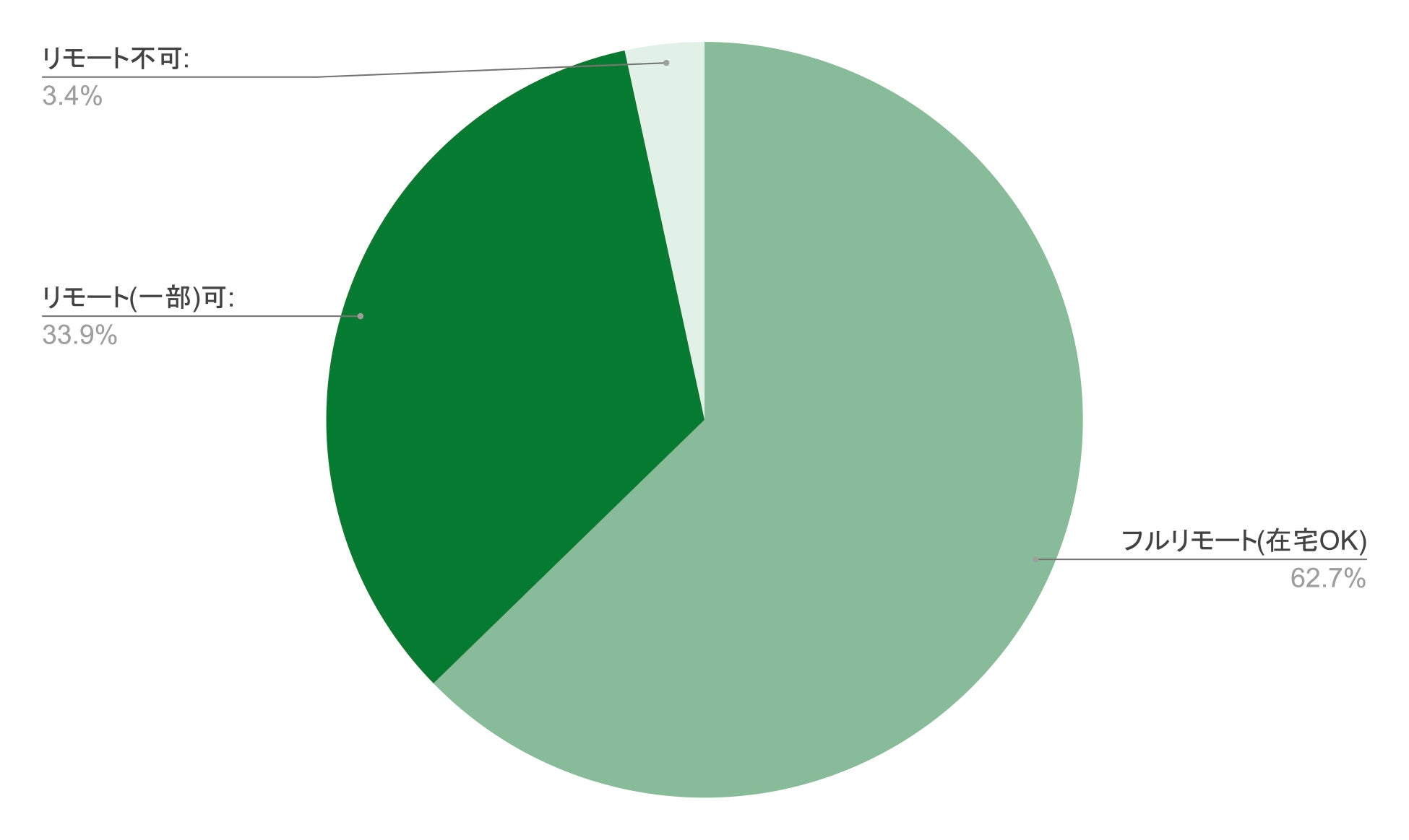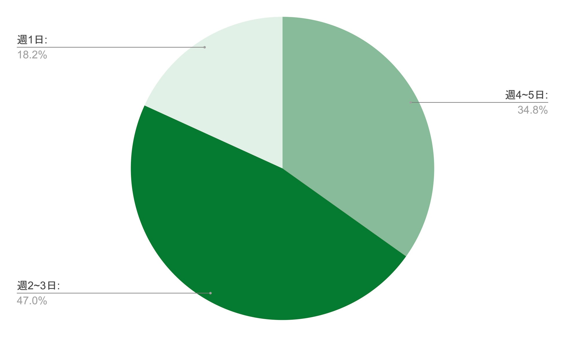 フルリモート対応が62.7%と約6割を占め、一部リモート可を含めると96%以上がリモートワークに対応しています。SEO業務はデータ分析やコンテンツ企画、レポート作成が中心のため、場所を選ばず進められる作業がほとんどです。稼働日数も週2〜3日が最多と柔軟性が高く、時間と場所の両面で自由度のある働き方が実現しやすい職種です。