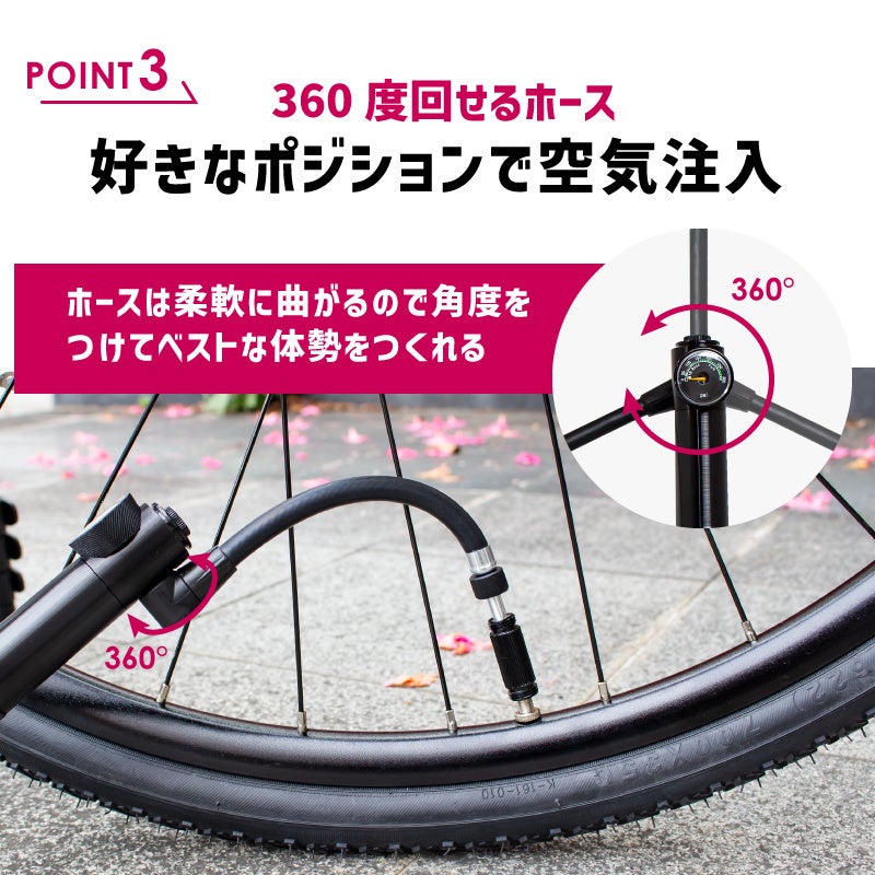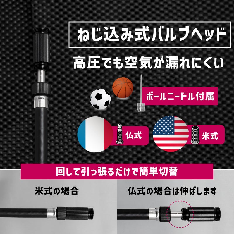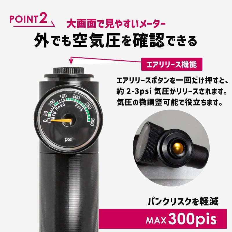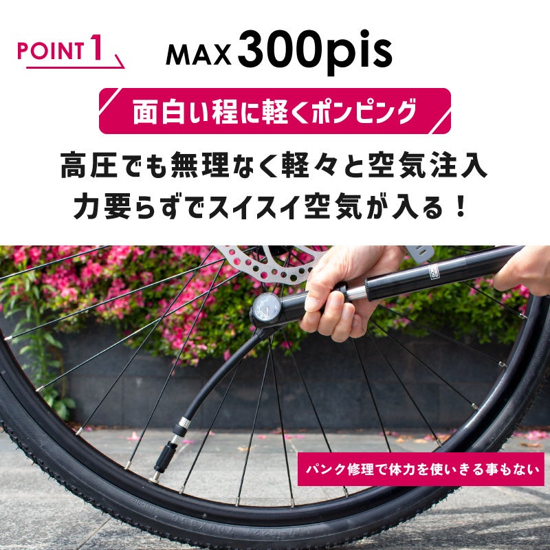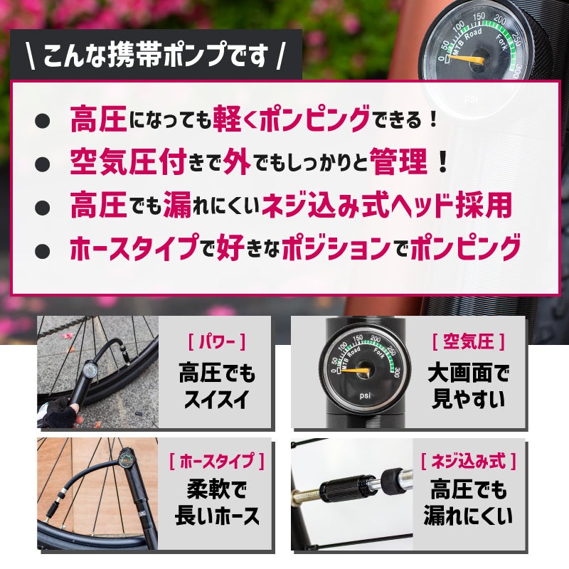 軽々と高圧まで空気を入れる事が可能な携帯空気入れです。最大空気圧300pisまで!ハイパワー自転車携帯ポンプです。仏式と米式に対応しています。