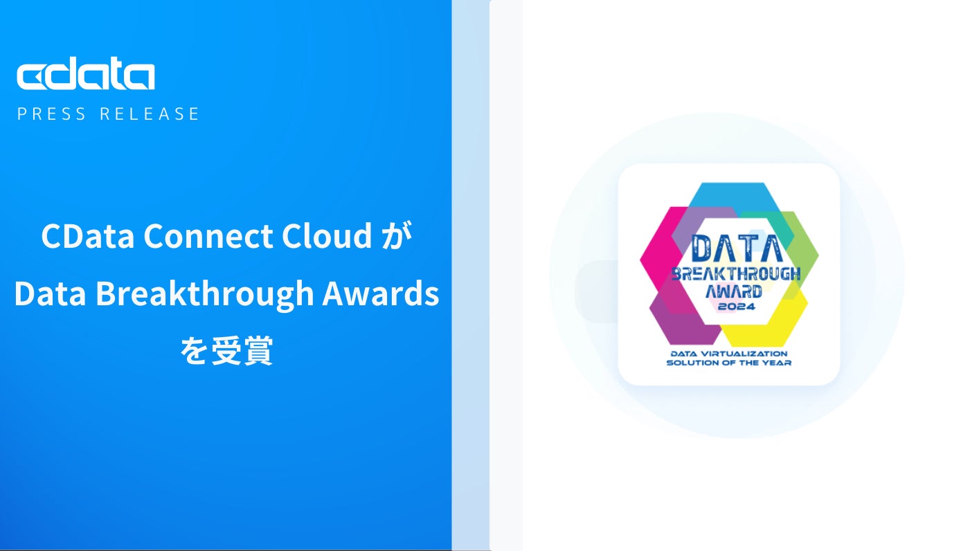 2024年4月22日、CData Software, Inc.(本社:アメリカノースカロライナ州、日本オフィス:宮城県仙台市、代表社員 職務執行者:疋田 圭介、以下CData)は、クラウドデータ仮想化サービスCData Connect Cloud がData Breakthrough Awards による『2024年、今年のデータ仮想化ソリューション(2024 Data Virtualization Solution of the Year)』を受賞したことを発表します。CData Connect Cloud は、2年連続でData Breakthrough Awards を受賞しています。CData は、引き続きイノベーティブなコネクティビティソリューションを提供し、企業のデータ活用をサポートします。