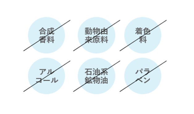 肌への負担が少ないアミノ酸系洗浄剤を使用した弱酸性処方です。肌への刺激となりうる成分は極力除き、6つの無添加処方を実現しました。