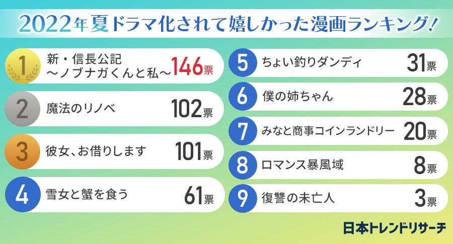 日本トレンドリサーチ(運営会社:株式会社NEXER)は、推し漫と共同で「ドラマ化されて嬉しかった漫画」に関するアンケートを実施し、結果をサイト内にて公開したので紹介します。