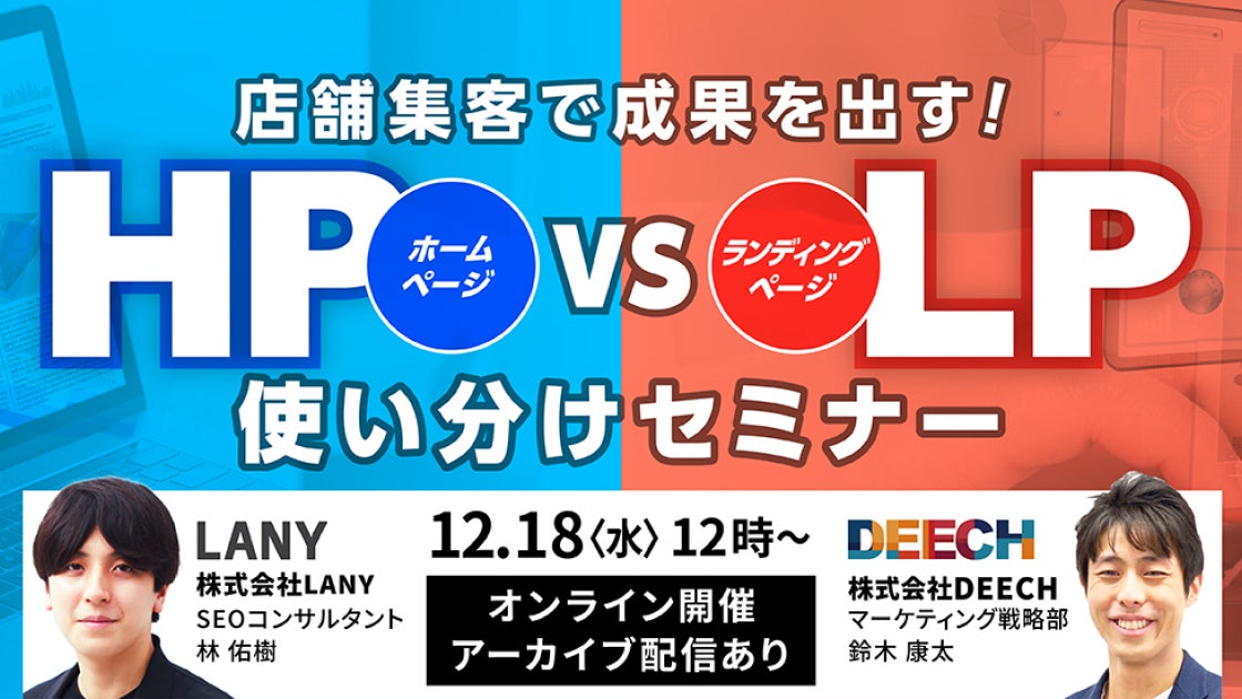 デジタルマーケティング支援を行う株式会社LANY(レイニー/本社:東京渋谷区、代表取締役:竹内渓太)は、株式会社DEECHと共催にて「 店舗集客で成果を出す!HP vs LP 使い分けセミナー」を12/18(水)に開催いたします。