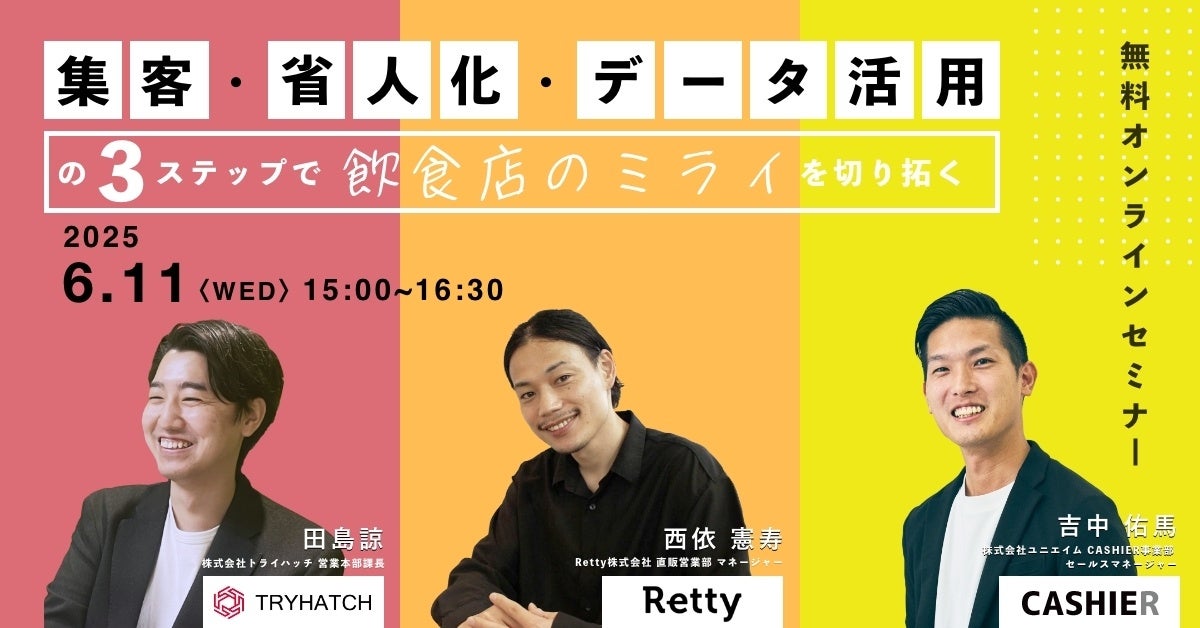実名口コミのグルメ情報・予約サイト「Retty(レッティ)」を運営するRetty株式会社(本社:東京都港区、代表取締役 執行役員CEO:武田 和也)は、株式会社トライハッチ(本社:東京都新宿区、代表取締役:武藤 尭行)、株式会社ユニエイム(本社:東京都渋谷区、代表取締役CEO:原口 宇志)と共催で、飲食店向けWebセミナー「集客・省人化・データ活用の3ステップで飲食店のミライを切り拓く」を6月11日(水)15:00にオンラインで開催します。