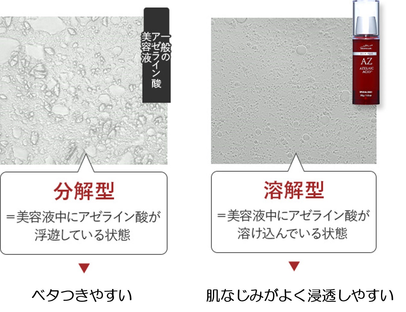 ディーププラスAZは、美容液中に純アゼライン酸を溶解する処方を採用し、低刺激で浸透しやすい乳液状のテクスチャーを実現させました。