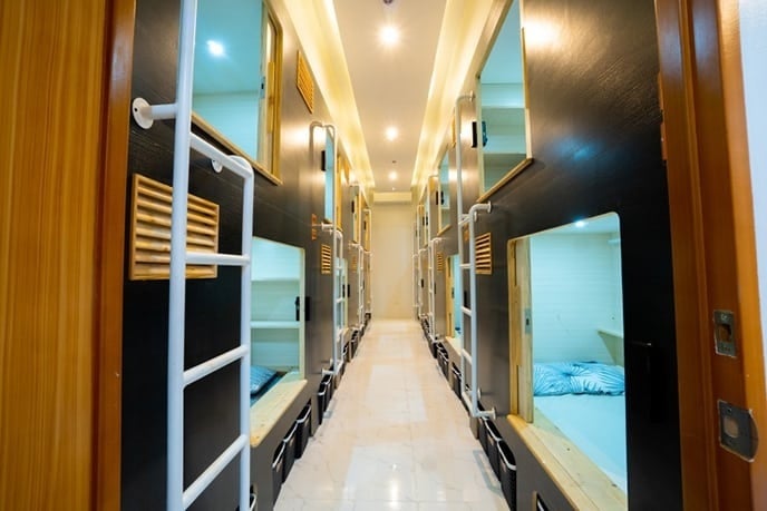 学校敷地内にカプセルホテルタイプの学生寮を併設しています。
