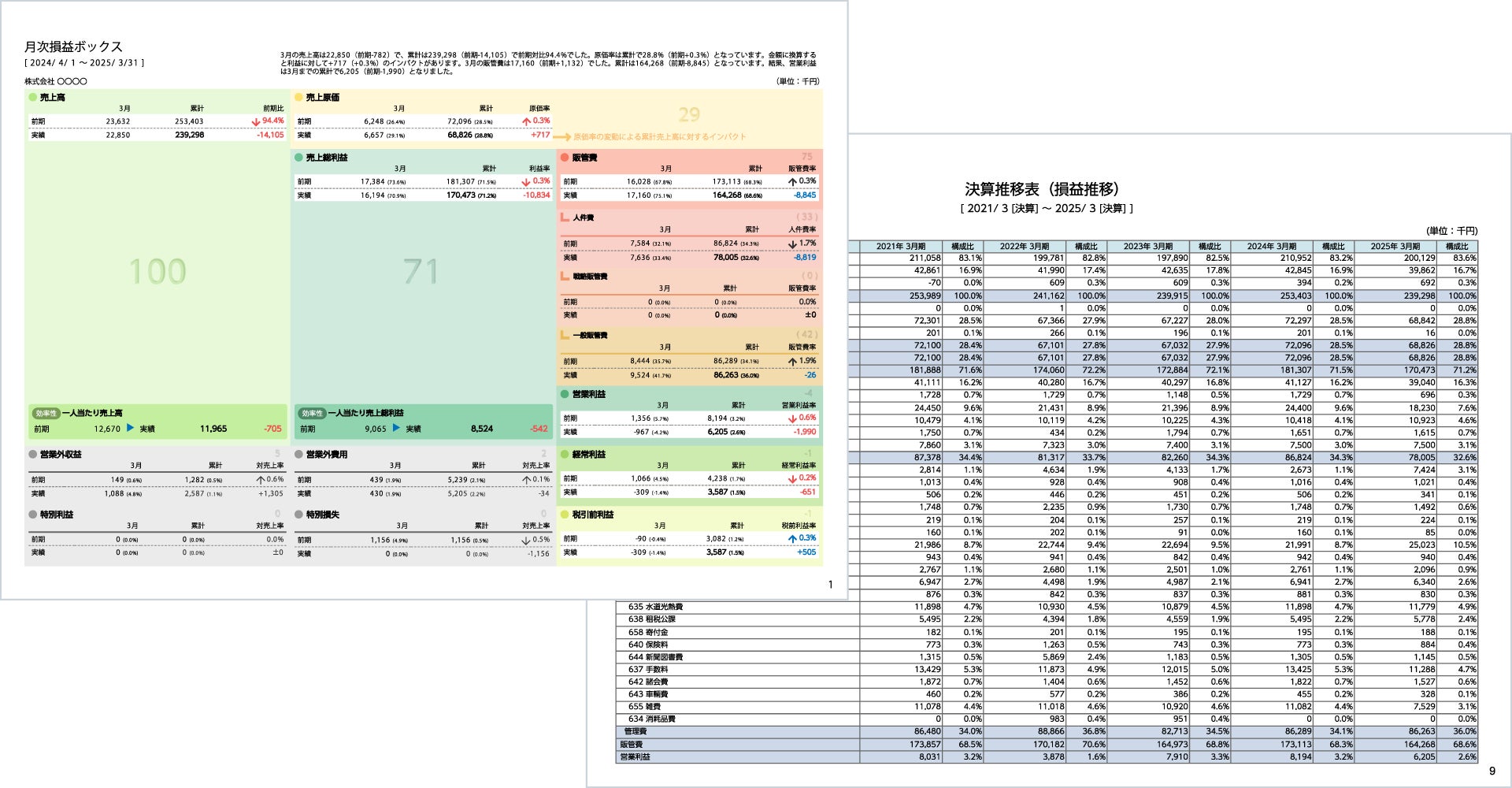 PL・CF・BSを順に深堀していく「月次ダイジェスト」と直近(最大5ヵ年)の傾向を把握するための「決算推移」2種類のレポートをまとめたレポートを作成します。