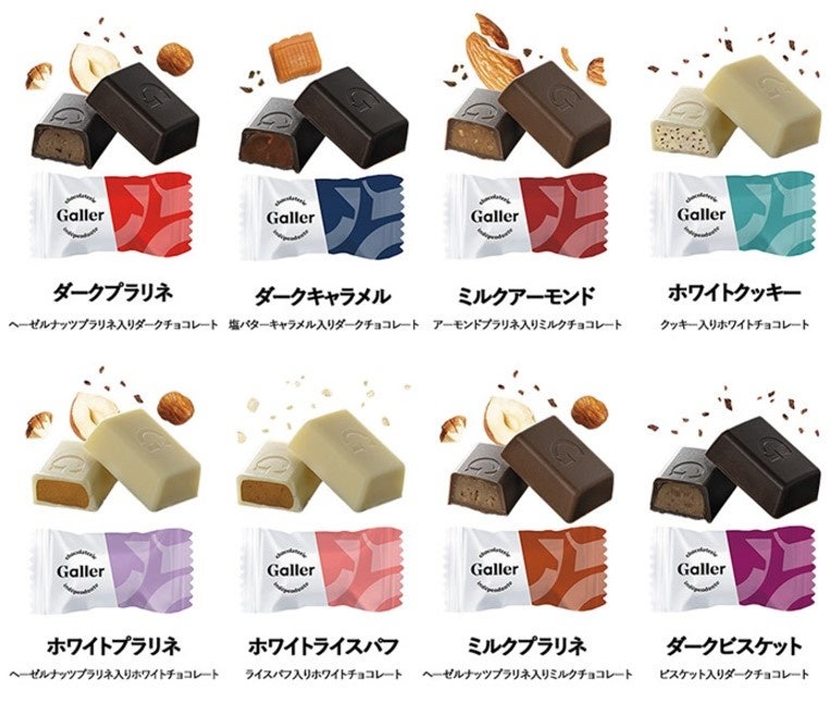今回のバラエティパックにアソートされるフレーバーは、全部で8種類!ヘーゼルナッツプラリネ入りダークチョコレート「ダークプラリネ」、塩バターキャラメル入りダークチョコレート「ダークキャラメル」、アーモンドプラリネ入りミルクチョコレート「ミルクアーモンド」、クッキー入りホワイトチョコレート「ホワイトクッキー」、ヘーゼルナッツプラリネ入りホワイトチョコレート「ホワイトプラリネ」、ライスパフ入りホワイトチョコレート「ホワイトライスパフ」、ヘーゼルナッツプラリネ入りミルクチョコレート「ミルクプラリネ」、ビスケット入りダークチョコレート「ダークビスケット」です。