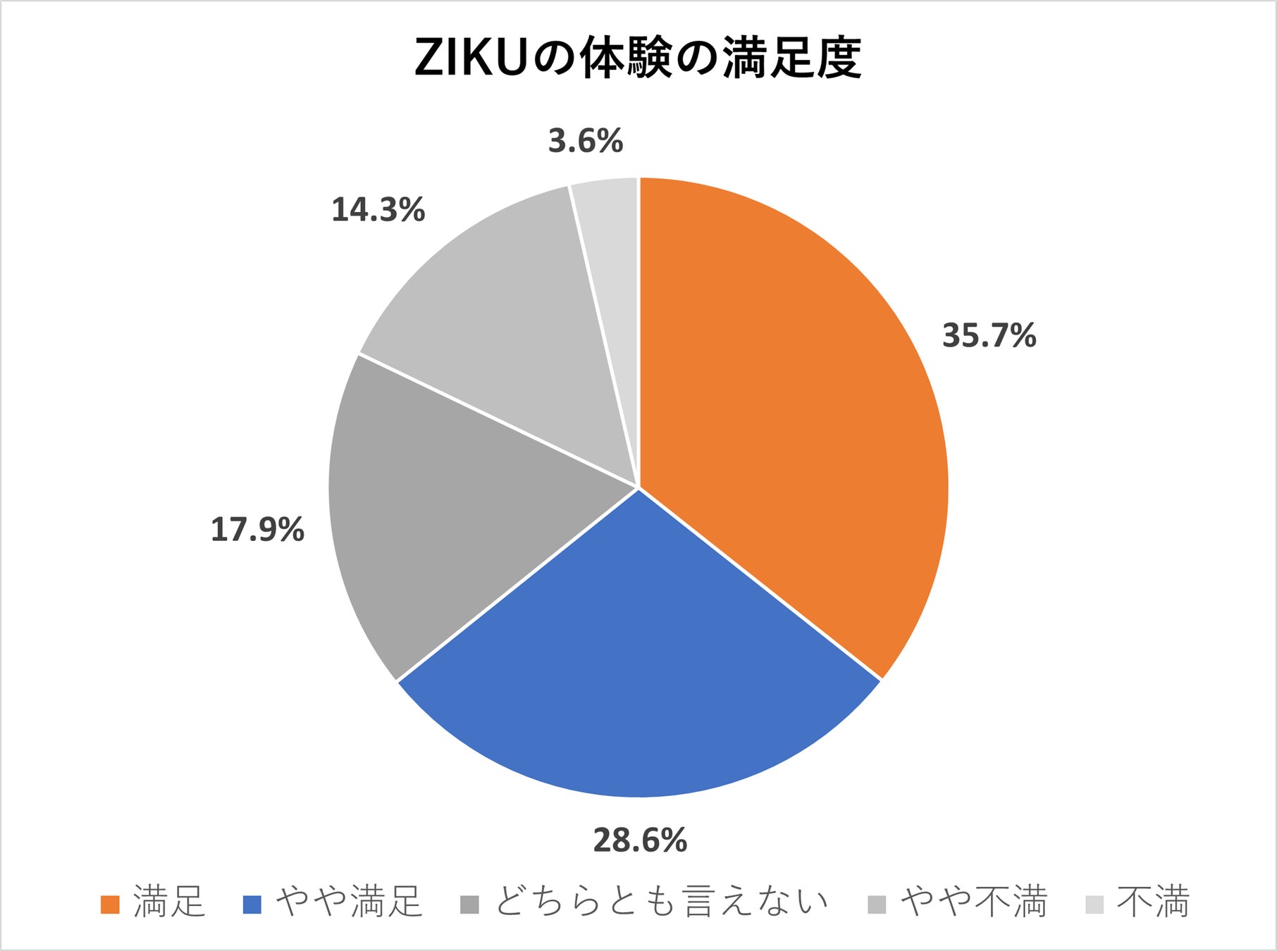 ZIKUの体験の満足度を尋ねたところ、「満足(35.7%)」と「やや満足(28.6%)」を合わせて、6割以上のかたが満足しているという結果でした。