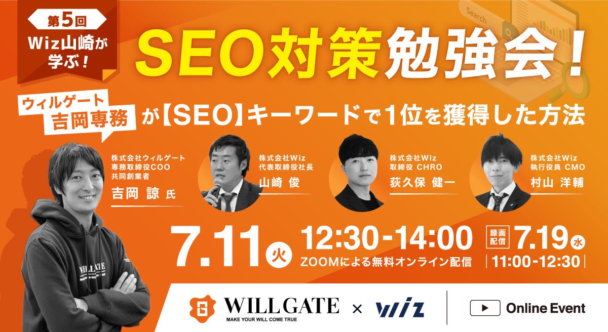 7/11(火)<第5回>Wiz山崎が学ぶ!ウィルゲート吉岡専務が【SEO】のキーワードで1位を獲得した方法を徹底解説!SEO担当者以外に社長や全社員がやるべきことを学ぶ【公開型勉強会】
