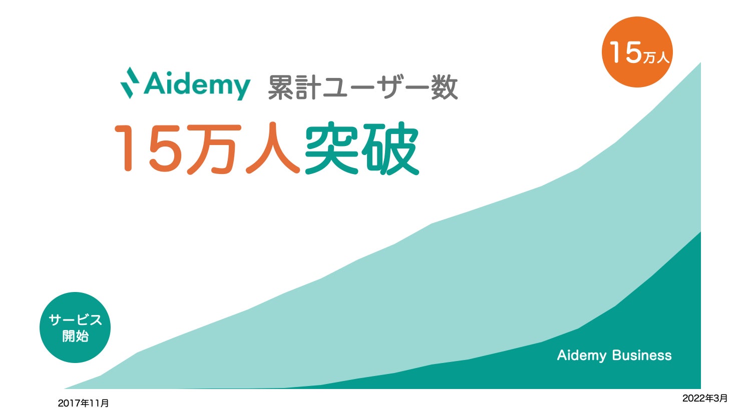 Aidemyはサービス開始約4年で登録ユーザー数15万人を突破した日本最大級のAI/DX・GXオンライン学習サービスです。