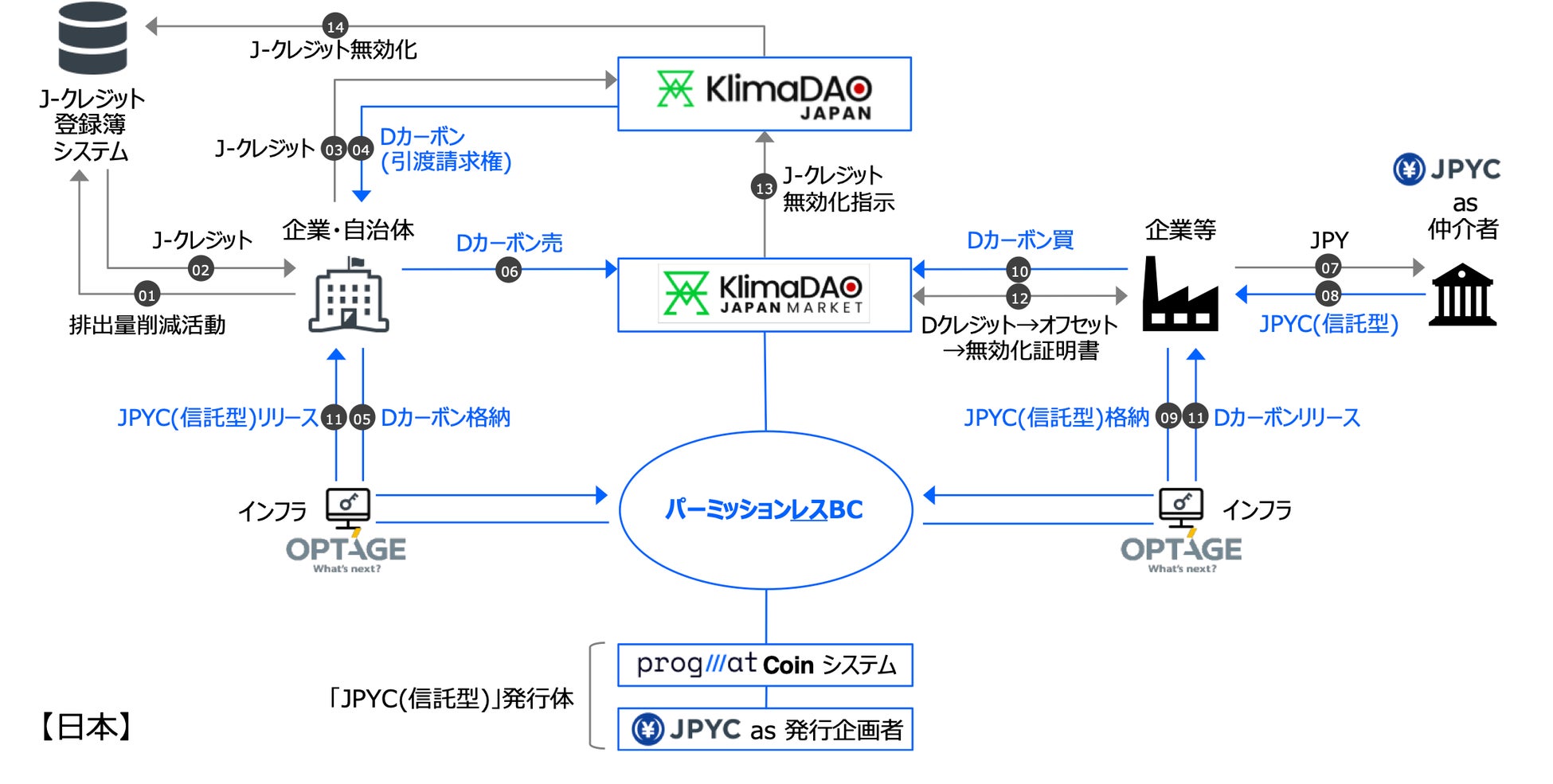 翔平、以下KlimaDAO JAPAN)、株式会社オプテージ(代表取締役社長:名部 正彦、以下オプテージ)は、「Progmat Coin(プログマコイン)」基盤を活用して発行されるステーブルコイン(以下SC)「JPYC(信託型)*1」を、デジタルカーボンクレジット(以下Dカーボン)決済に活用するための共同検討(以下本共同検討)を開始いたしました。