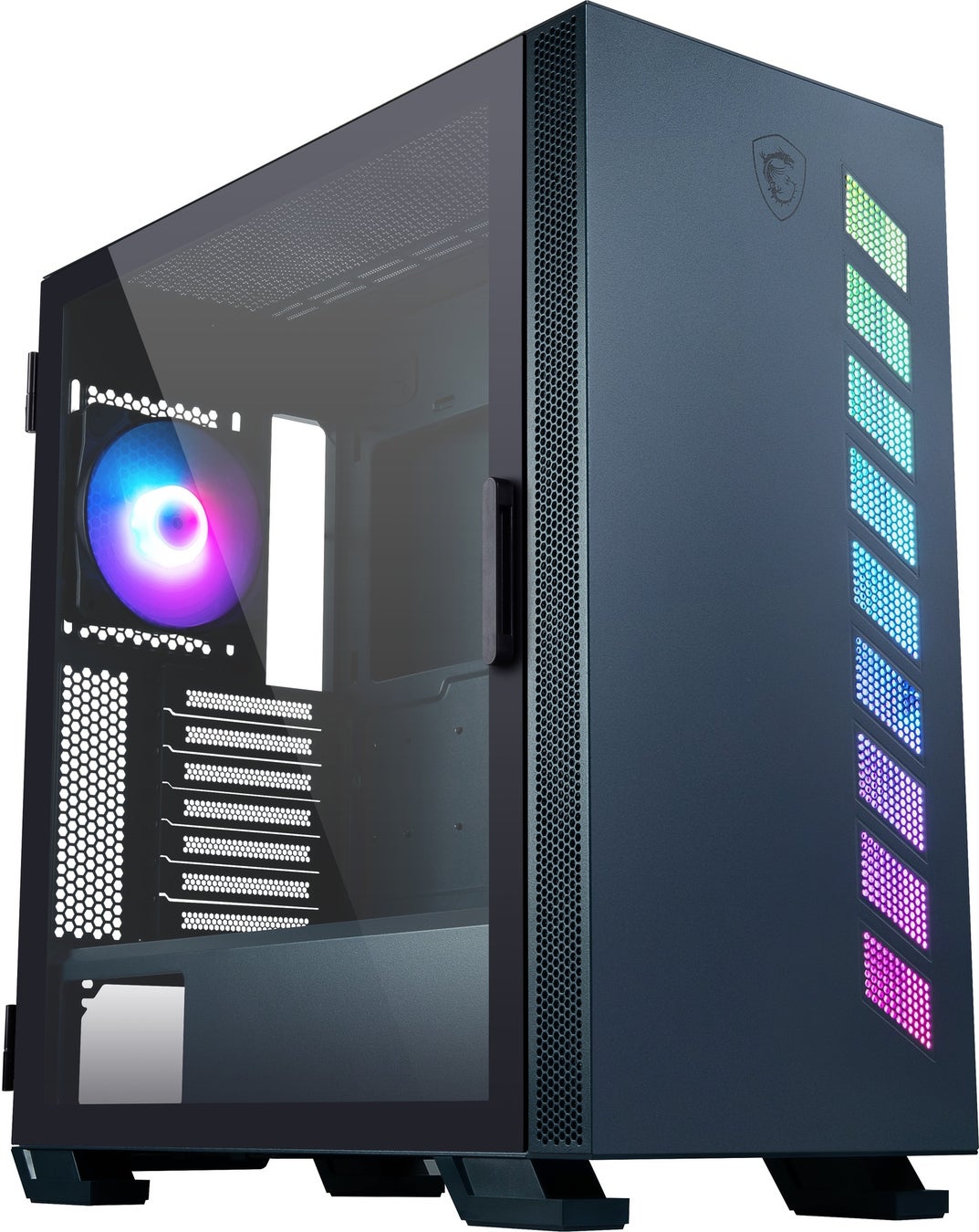 強化ガラスを採用した、ヒンジ構造のサイドパネルを搭載。「Mystic Light」に対応するRGB LEDストリップを備えており、印象的なフロントパネルに仕上げています。
