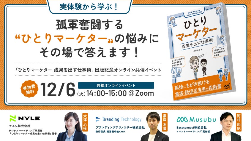 ナイル株式会社(本社:東京都品川区、代表取締役:高橋 飛翔、以下、ナイル)は、新刊『ひとりマーケター 成果を出す仕事術』(2022年10月31日発売、マイナビ出版)の出版記念として、12月6日(火)に、ブランディングテクノロジー株式会社、Baseconnect株式会社とオンラインイベント(無料)を、共催します。