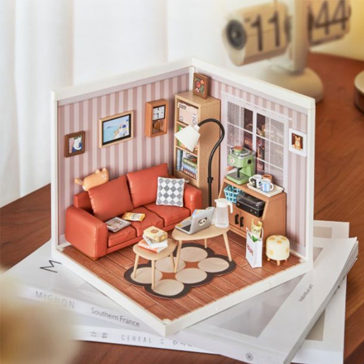 温かみのあるカラーのインテリアで統一された「リビングルーム」。座り心地の良さそうなソファやエスプレッソマシンなど、こだわりの詰まった家具が置かれています。実際にライトをつけることができるスタンド式の間接照明や、ふわふわとしたフロッキー加工が施されているクッションなど、細部まで作りこまれた小物がポイントです。