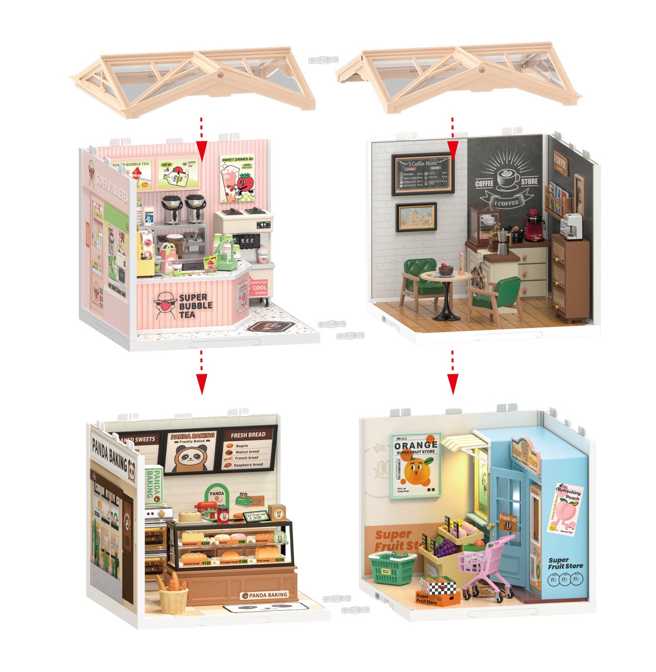 所要時間は約1時間、プラスチック製のパーツを組み立てていくだけで完成するため、初心者の方でも簡単につくることができます。また、クリエイターシリーズ(全7種)のハウス同士は連結可能で、縦横自由につなげて飾れます。フィギュアやカプセルトイの小物とも相性抜群なので、一緒に飾ったり、写真を撮ったり自由にお楽しみください。
